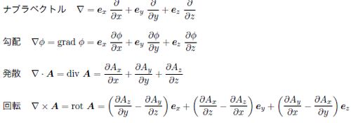 grad, div, rot については、山ほどの解説ページが存在するが、一言で言ってしまうと次のような感じ。・勾配 gradφ:スカラー場のある地点φでエネルギーが最も大きく変化する方向を示す。∇φで示せる。スカラー→ベクトル ・発散 divA:ベクトル場の、ある地…